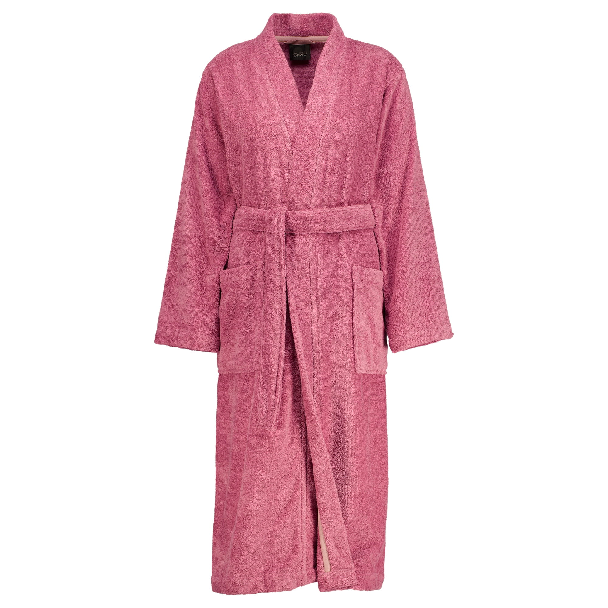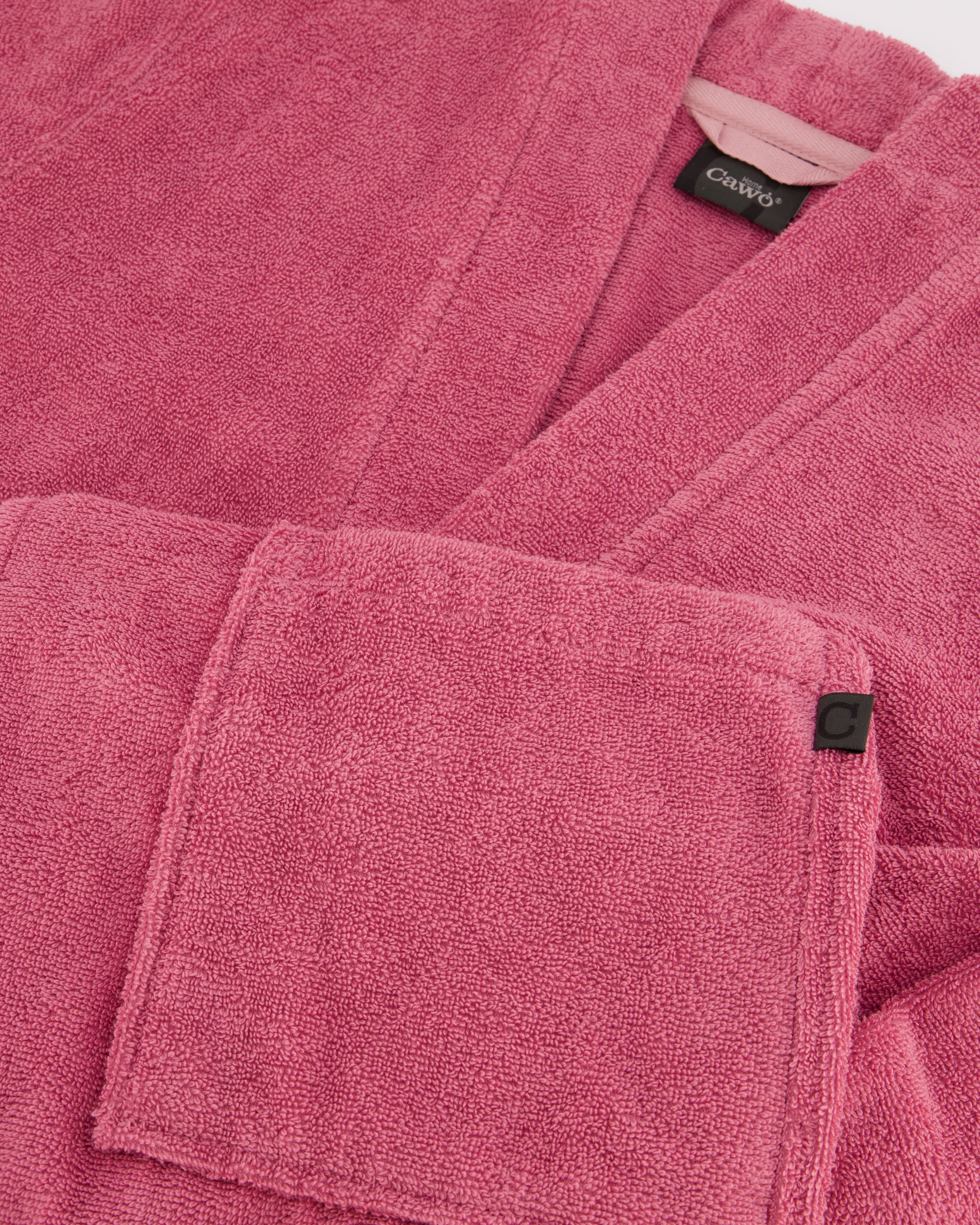 Der Cawö Home Bademantel 826 für Damen in bequemer Kimono-Form zeigt sich in einer besonders hochwertigen Verarbeitung und ist damit ein äußerst bequemer Spa-Begleiter für anspruchsvolle Frauen. Zwei große, aufgesetzte Taschen bieten Platz für diverse Kleinigkeiten und der Bindegürtel beton raffiniert Ihre weibliche Silhouette. Entlang des Kimono-Kragens und der Bademantelöffnung ziert eine dezent angebrachte, farbgleiche Bordüre das schlichte Kleidungsstück. Ein praktischer Aufhänger an der Innenseite des Kragens gestattet überall ein ordentliches und griffbereites Unterbringen.